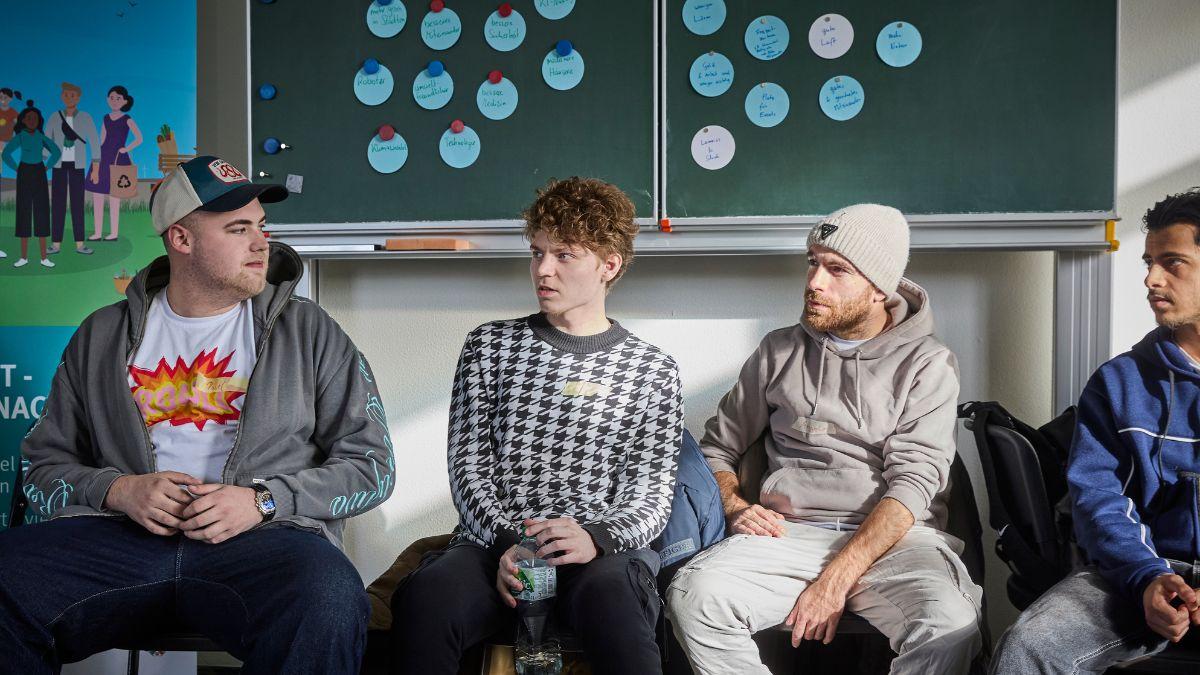 Im Plenum betrachtete die Gruppe alle entstandenen Zukunftsbilder und tauschte Eindrücke aus. Die Ergebnisse sollen nun auf den Fluren der VHS ausgestellt werden. Da viele Schüler:innen sich wünschten, dass ihre Arbeiten von noch mehr Menschen gesehen werden, prüft das Team von MehrWertRevier derzeit weitere Ausstellungsmöglichkeiten an öffentlichen Orten in Düren.